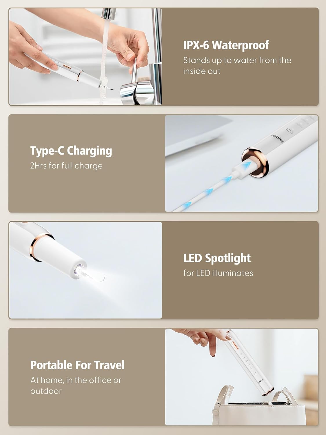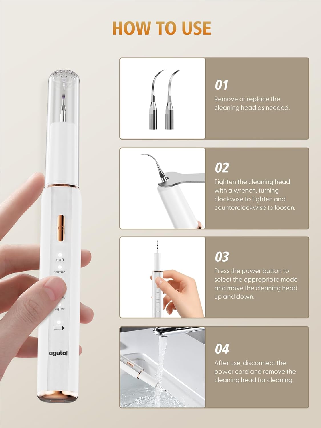 USB Rechargeable: The dental cleaner features built-in 500mAh battery charging capability. Ensure a full charge before initial use. A fully charged unit provides 3-5 hours of continuous operation.