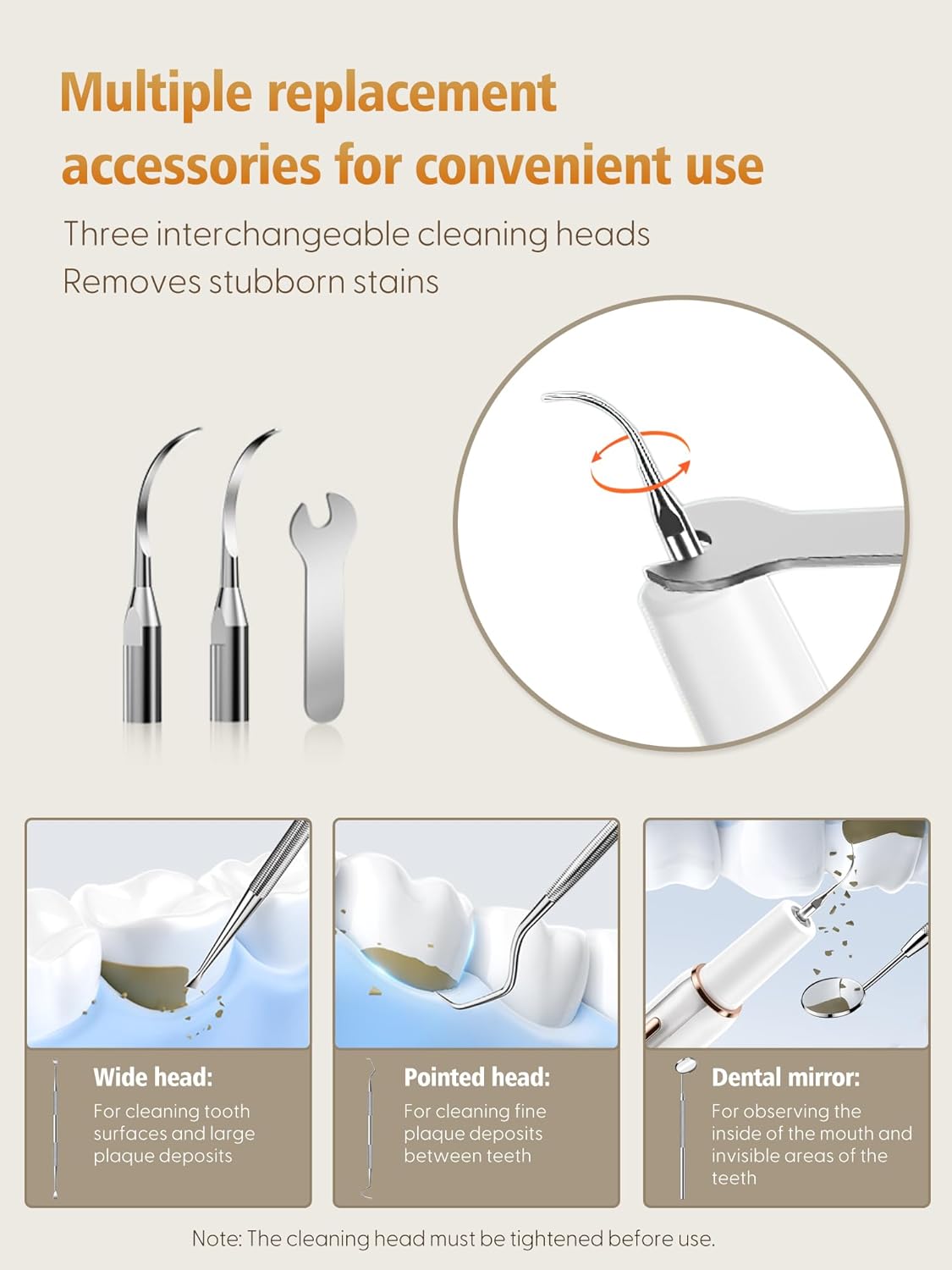 FULL COVERAGE: You get a plaque remover for dogs, 3 replacement tips, a wrench, a charging cable, and a dental care set (a dental mirror, a soft dental tool, and a double-ended inspection tool). The pointed tip removes small stains from delicate gums. The flat tip removes larger plaque from the surface of teeth. For a safe and comfortable tooth cleaning experience.