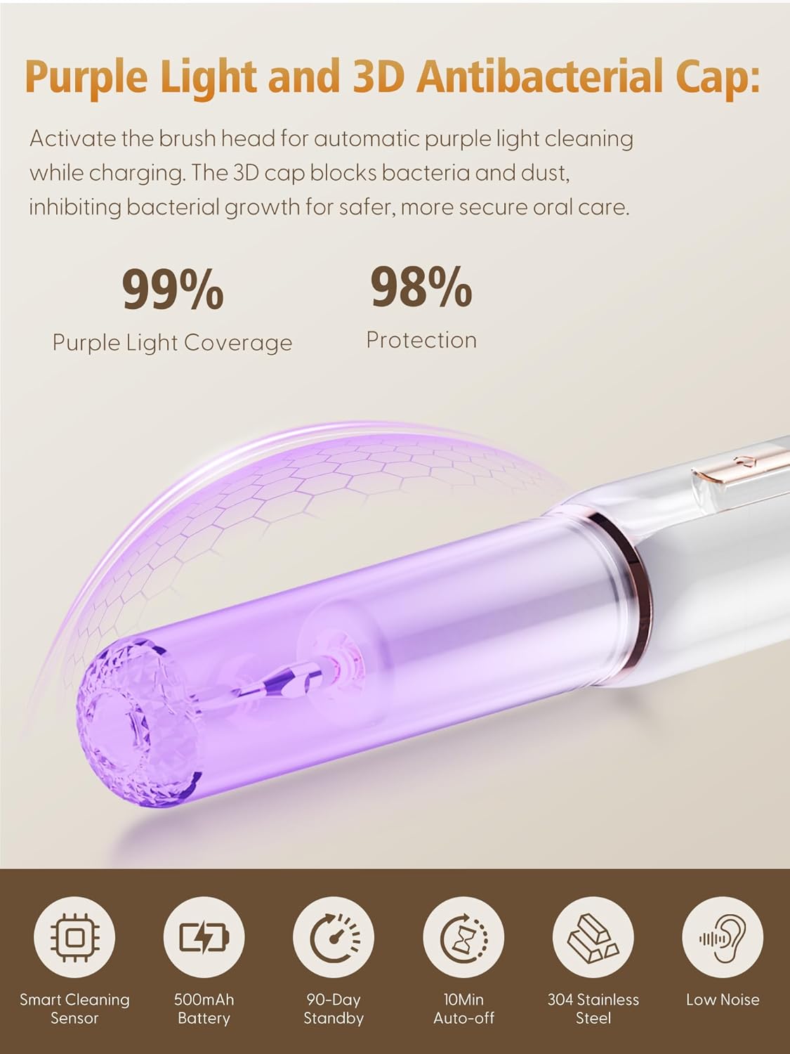 Water-ResistantEmploying advanced waterproof technology, it operates reliably even in splash-prone environments, ensuring use in bathrooms and delivering a hassle-free experience. | Ring LED Light & Dental MirrorsThe high-brightness LED light, when used in conjunction with a dental mirror, effectively illuminates blind spots within the oral cavity. | Purple Light & 3D CoverAutomatic 10-minute UV sterilisation during charging. The 3D protective cover shields against insects, bacteria and dust, providing safer and cleaner oral care for your beloved pet. |