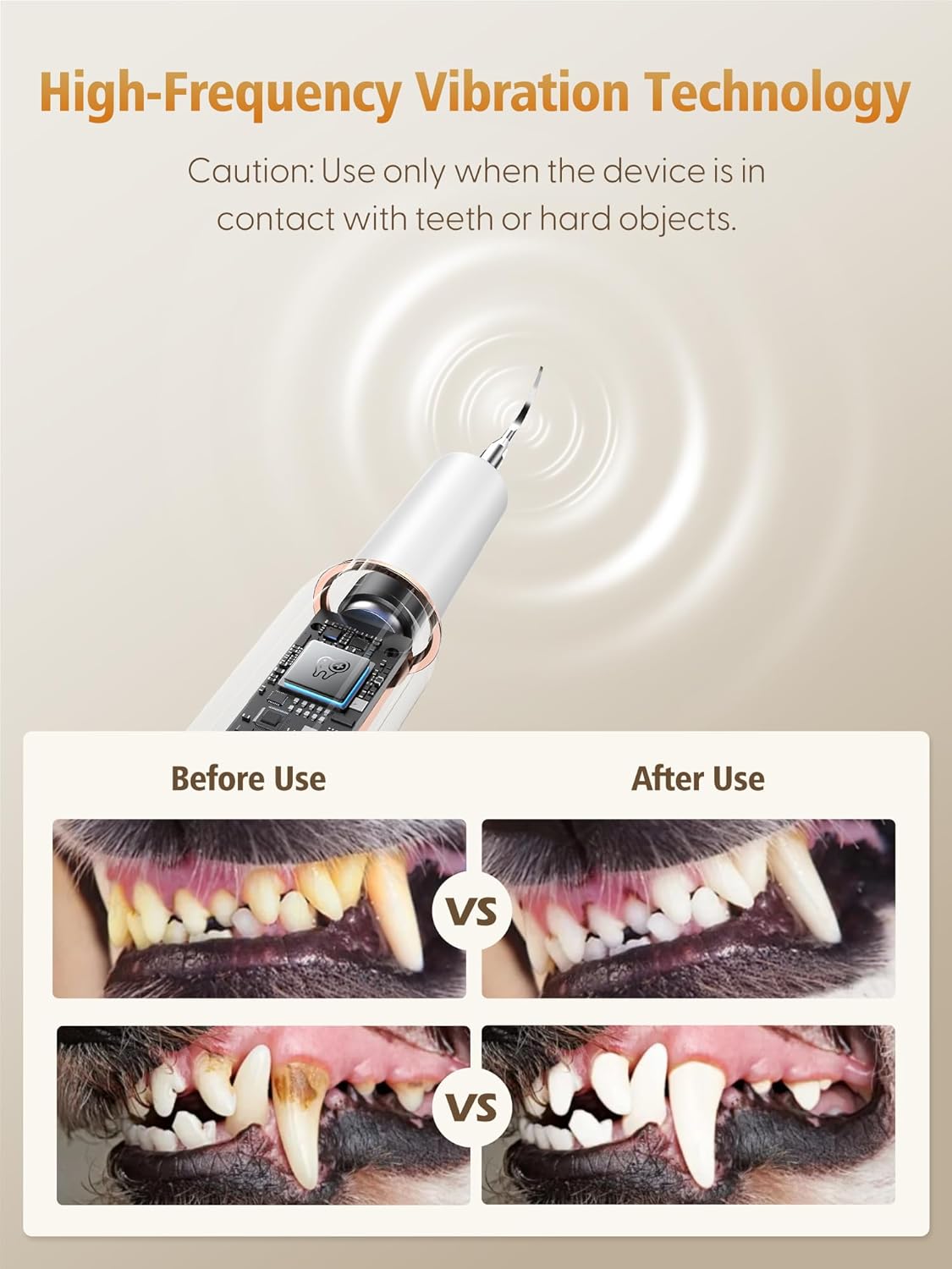Low-noise Design: Employing ultrasonic technology, this product operates without vibration or audible noise when powered. It activates only upon contact with hard surfaces like teeth, producing minimal operational noise to prevent discomfort for pets due to excessive sound.
