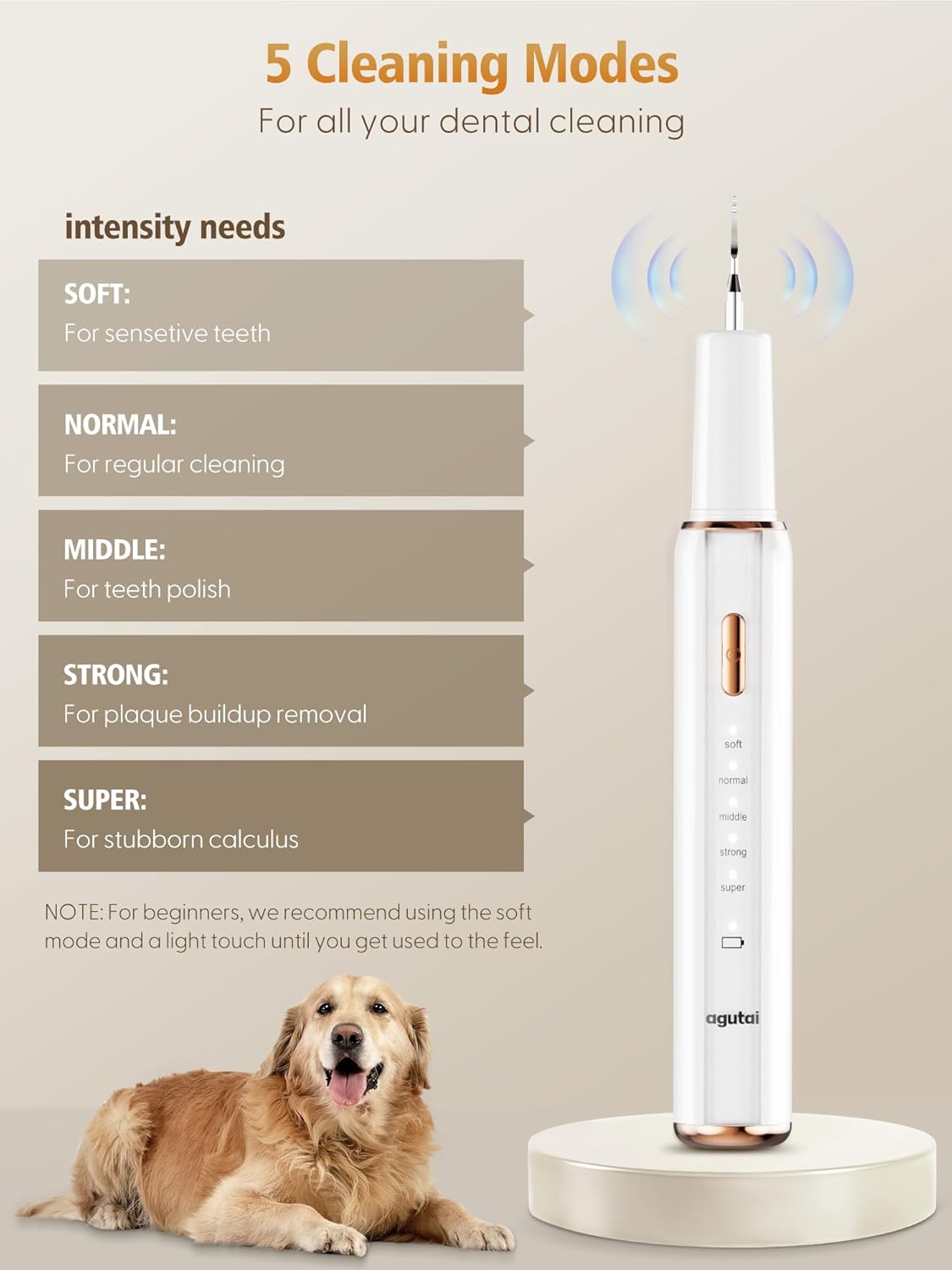 5 CLEANING MODES: This dog tartar remover features 5 modes (gentle, normal, medium, strong, and extra) to accommodate varying gum sensitivities. Low noise and vibration reduce pet fear, resulting in quieter operation. (Please select the gentle mode until your pet is accustomed to the feel; patiently teach them that this won't hurt.)